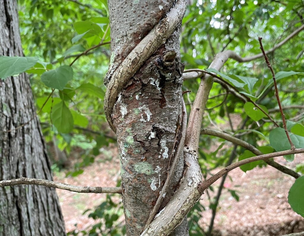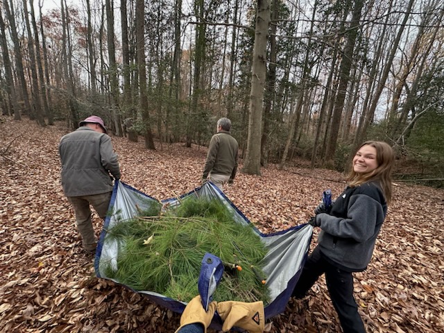 Months before the wreath-making and sale, volunteers go out in the woods and cut Oriental bittersweet vines. Bittersweet is non-native and aggressively invasive.