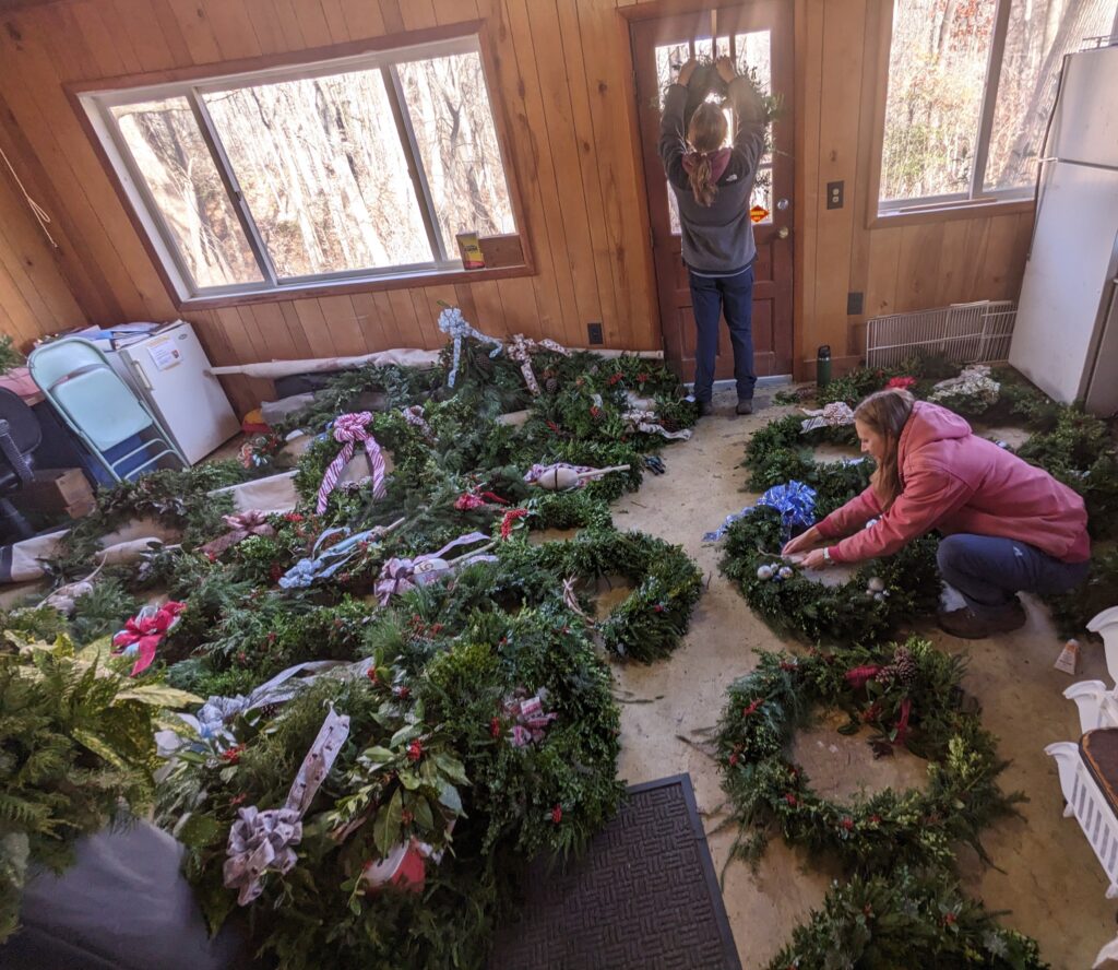 The final step (before loading the wreaths into several vehicles and hauling them down to the South Side Trailhead) is to check each wreath to make sure it will last well into the holidays. Autumn Phillips-Lewis, Land Manager (seated) sets the price of each wreath while Addie Brown, CCCC Member, checks each wreath.