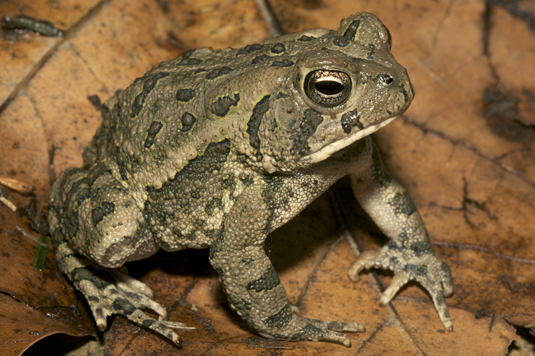 Fowler’s Toad () Fowler’s toad is one of the two true toad species found in Maryland, the other is the American toad. Like the American toad, Fowler’s toads are usually brown with short back legs for hopping and glands on the side of their heads that excrete toxins. These toxins aren’t particularly dangerous to humans, though you may not want to rub your eye after picking up a toad. The easiest way to differentiate Fowler’s toads from American toads is by the density of bumps (or “warts”) on their bodies. Fowler’s toads usually have 3-4 bumps per dark brown patch, while American toads generally only have 1-2. Fowler’s toads are usually 2-3 inches long and breed in a variety of wetlands, especially those that are shallow and have sandy bottoms. You may see them hopping through forests or meadows or hear their calls that sound a bit like a sheep saying “baaaa” or a series of short, repeated yells: Fowler's Toad Call