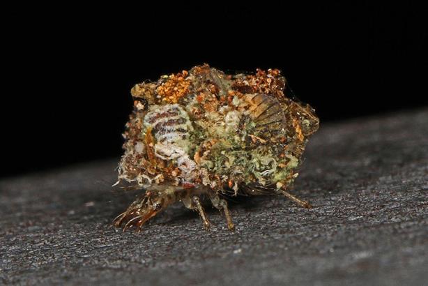 But wait! There's more to this story! An Aphid Lion, alone and unprotected, is a juicy target for insect or bird predators. Thus, as soon as they leave the egg, some Lacewing larvae begin collecting items to form a shield' on their backs. This protective cover may consist of spent egg cases, the shed skins of molting larva, or the withered bodies of the Aphid Lion's victims. Over time a significant pile of detritus accumulates atop the larva; the perfect camouflage for a tiny, but fearsome predator.