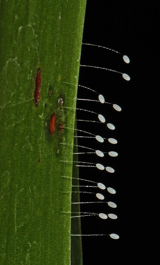 Each egg is cleverly placed at the end of a slender stalk which is coated with ant repellent. The stalks may also prevent newly hatched lacewing larvae from eating their unhatched siblings!
